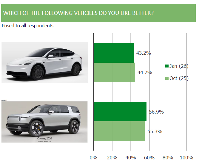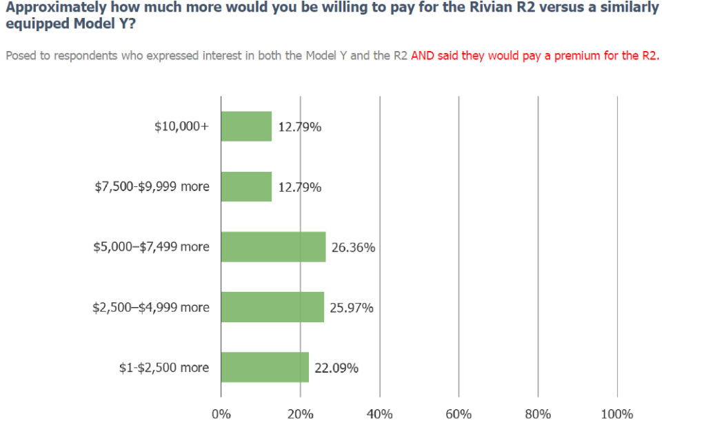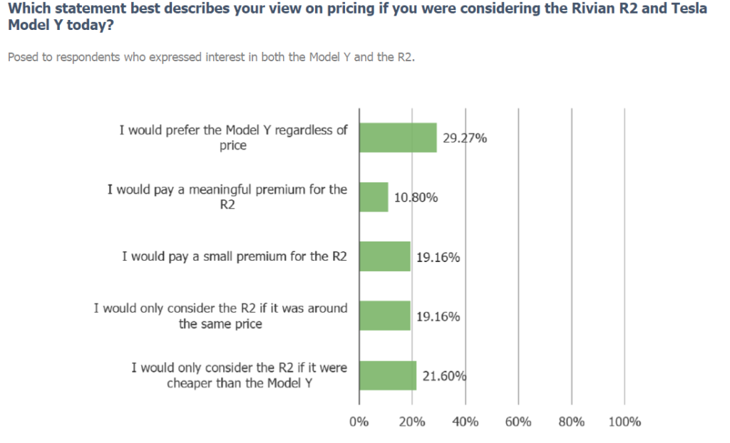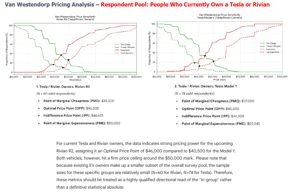 • Turning to our Van Westendorp pricing analysis conducted via LLM, the data is constructive around pricing power for the upcoming Rivian R2 in the sense that it performs as well (or better) than the Model Y. Naturally, feedback is stronger among existing EV owners and parties interested in the vehicles compared to the general population.